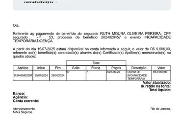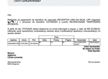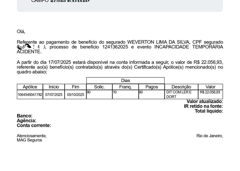 Pagamento Diária de incapacidade temporária Acidente - DIT